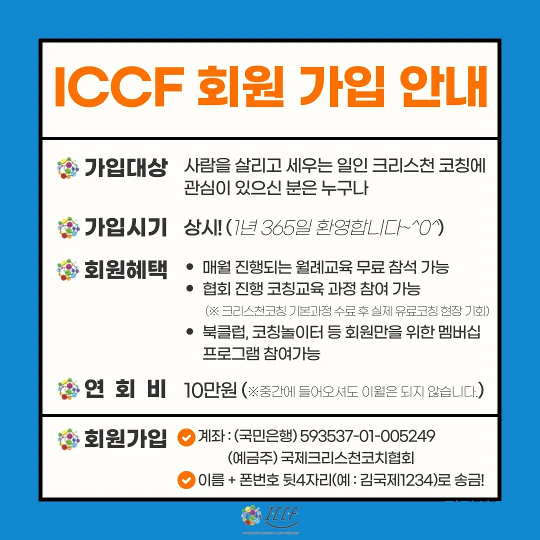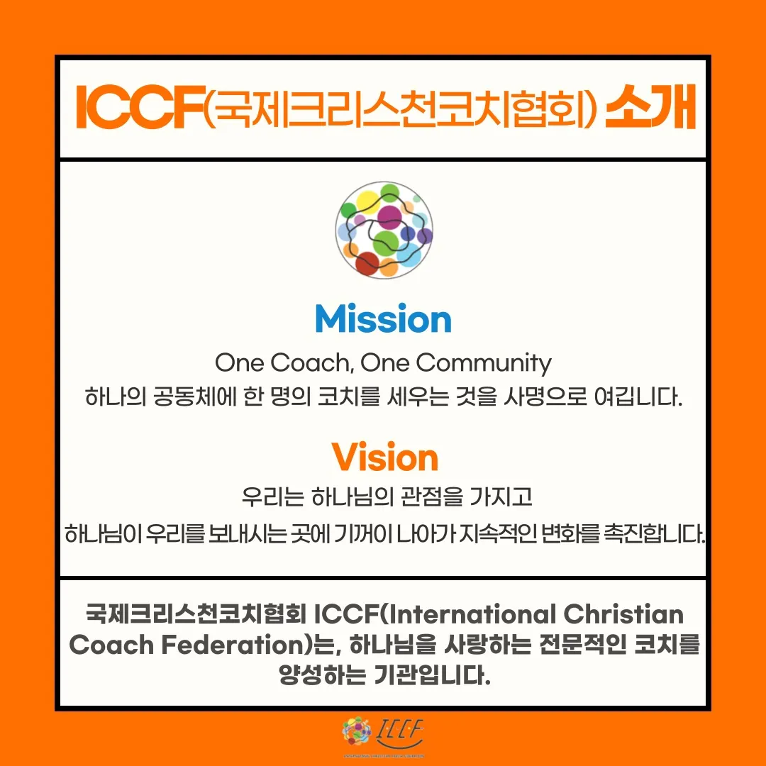 One Coach, One Community의 비전을 품고, 하나의 공동체에 하나님의 마음으로 회복의 통로가 될 수 있는 한 명의 크리스천 코치를 세우기 위해 만들어졌습니다.ICCF(국제크리스천코치협회)의 회원 규정은 다음과 같습니다.사람을 살리고 세우는 일인 크리스천 코칭에 관심이 있으신 분은 누구나 회원이 되실 수 있습니다.