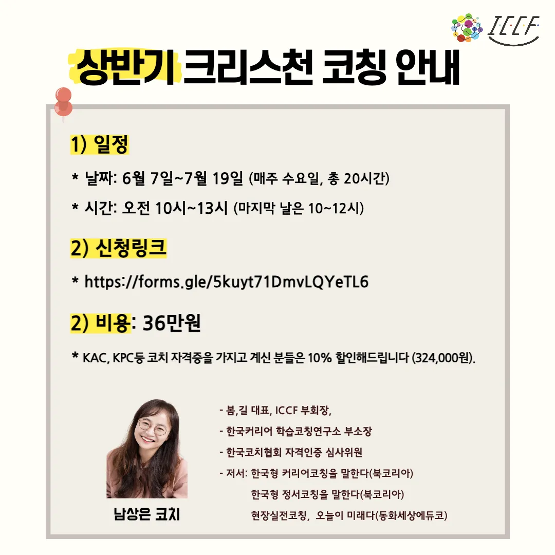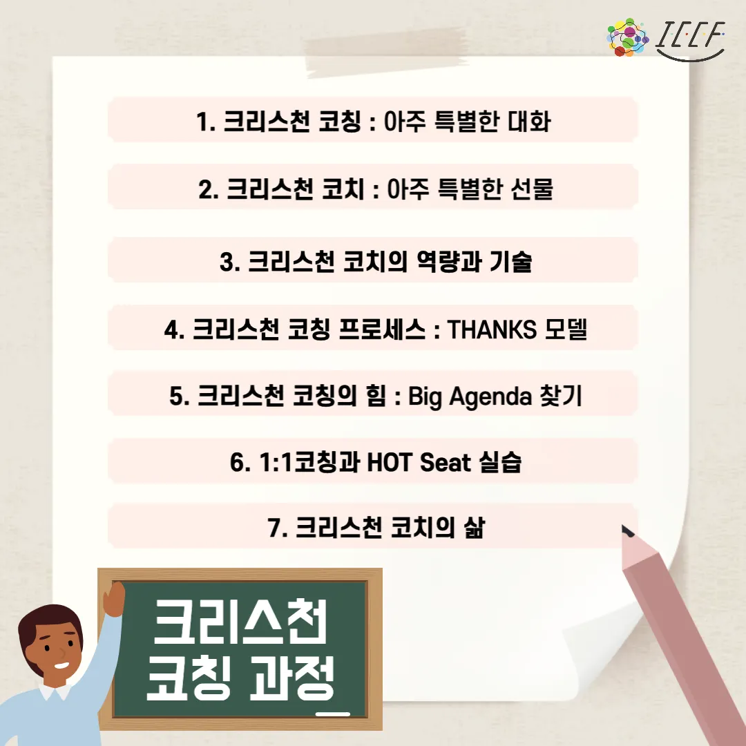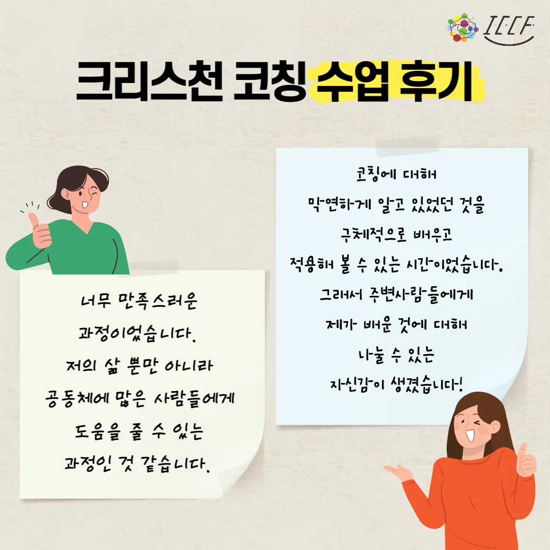 본 과정은 국제 크리스천 코치 협회(ICCF / 협회장 한건수)의 필수 과정으로 인정됩니다.