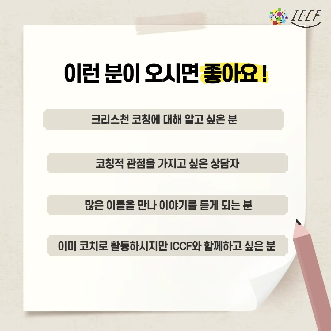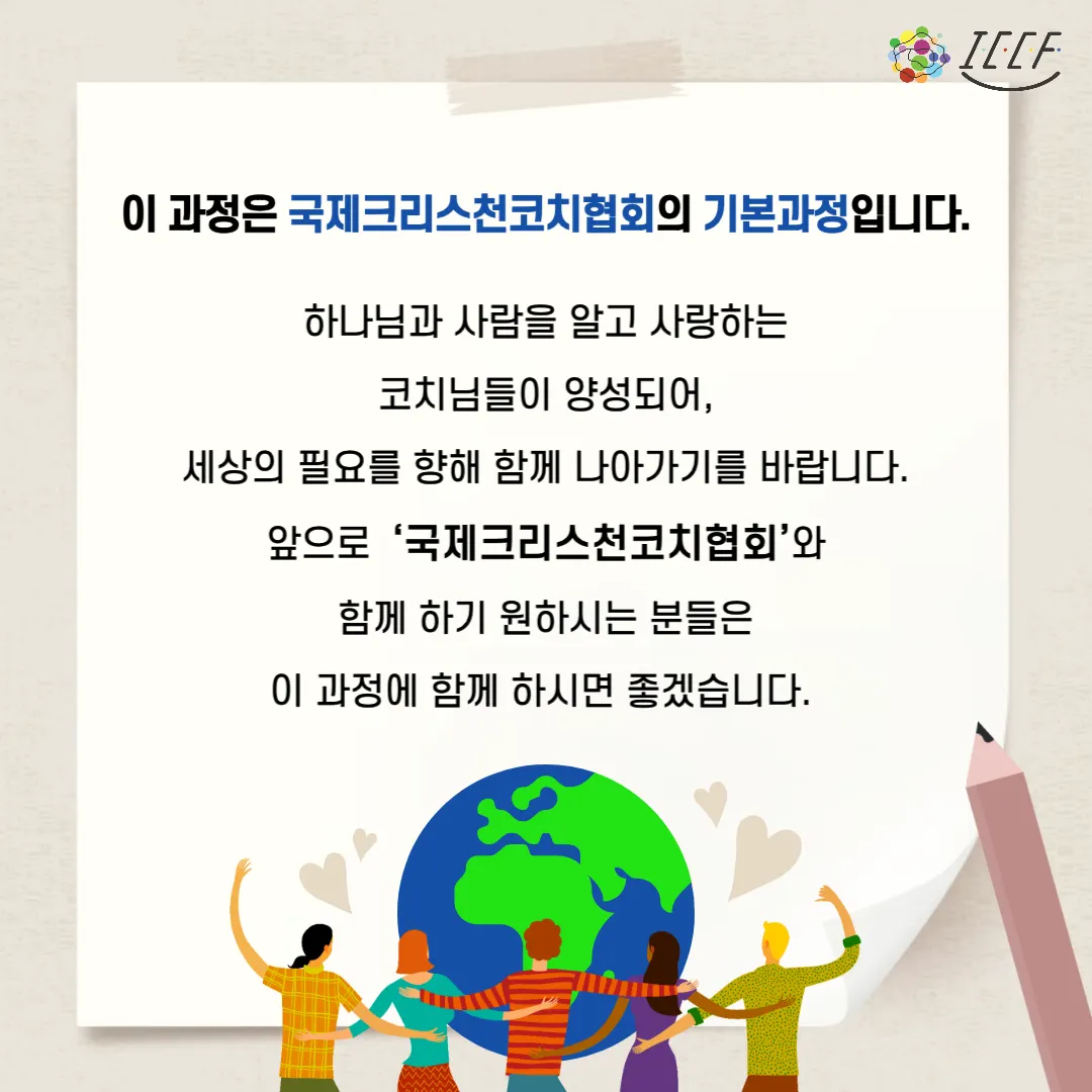 앞으로 국제 크리스천 코치 협회와 함께 하기 원하시는 분들은 이 과정에 함께 하시면 좋겠습니다.