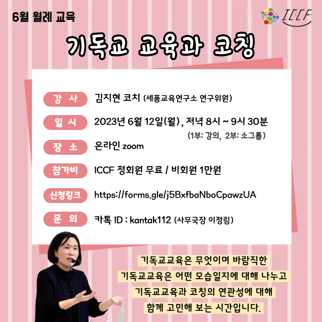 내 용 : 기독교교육은 무엇이며 바람직한 기독교교육은 어떤 모습일지에 대해 나누고 기독교교육과 코칭의 연관성에 대해 함께 고민해 보는 시간입니다참가비 :