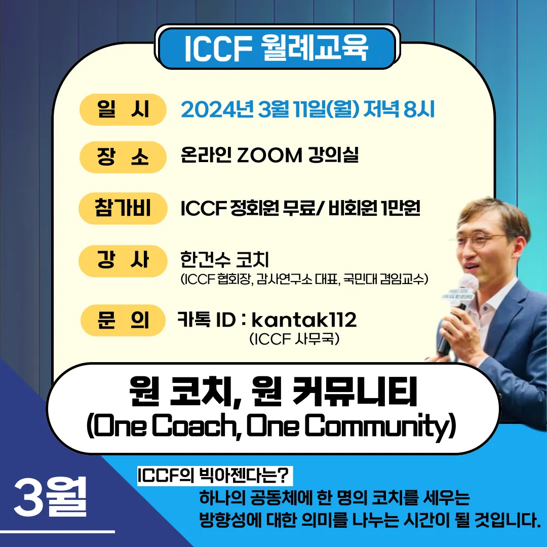 ICCF에서는 매월 1회 회원들의 코칭 역량 향상을 위한 교육을 제공합니다.